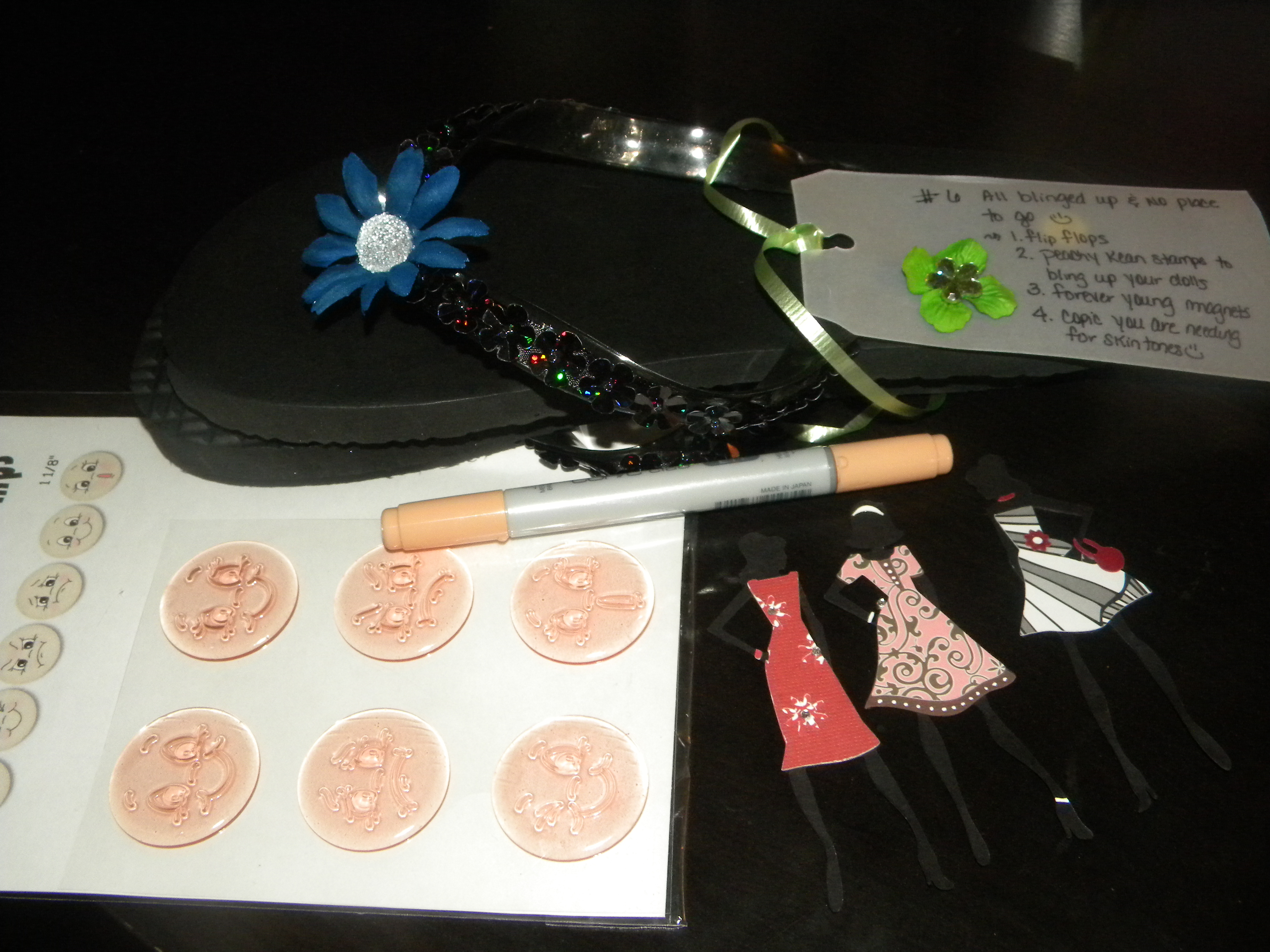 11. All Blinged Up and No Place to Go! Lots of goodies in this one – Including some GREAT Peachy Keen Stamps!! YAY! She gave me a Copic Marker AND This Blinged up Flip Flops!