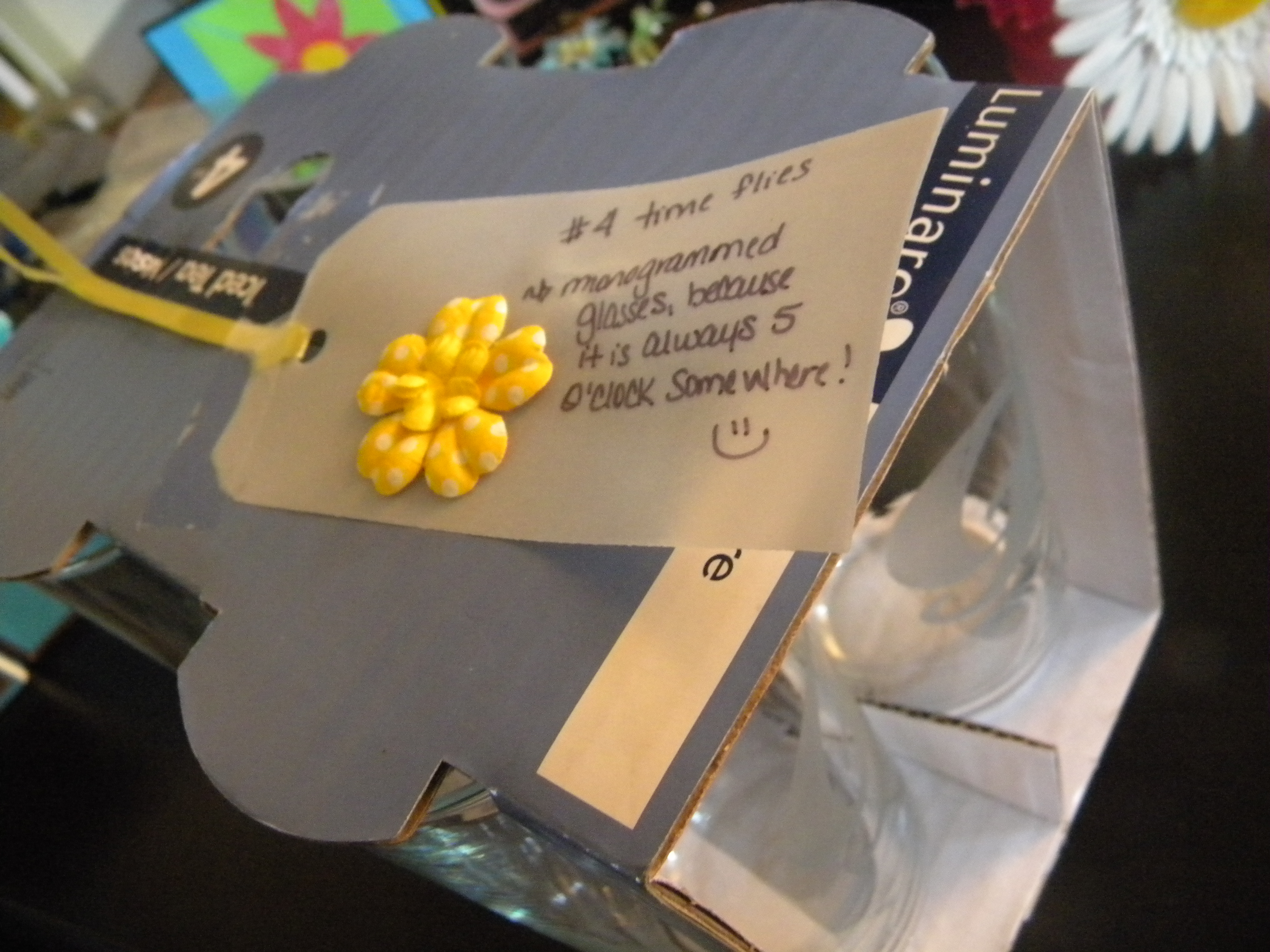 9. Time Flies By. (Now this was taking the words to a different box TOTALLY and I think its so cute…Cammi glass etched this set of glasses for me – because its always five o’clock somewhere! LOL I love it!)
